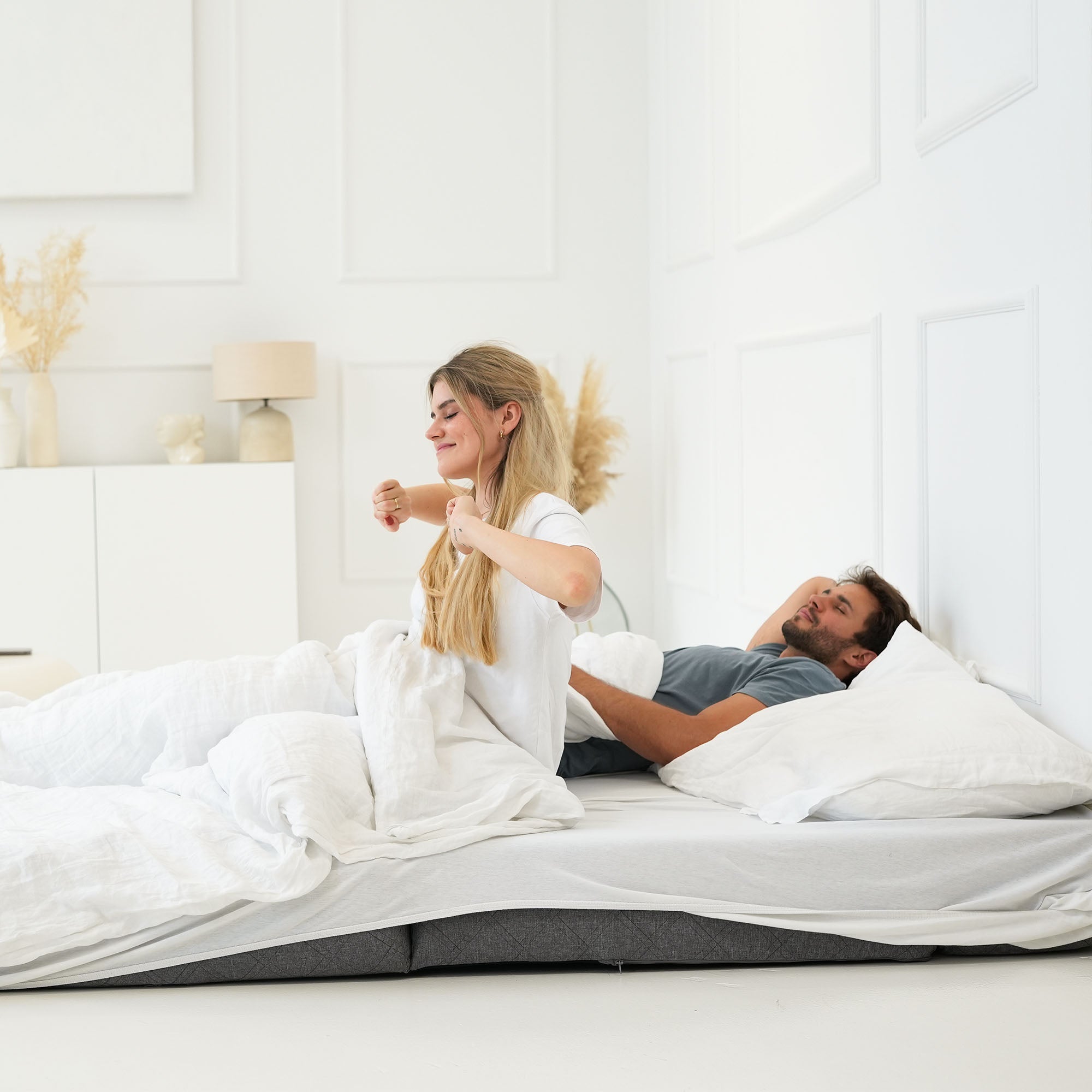 Unsere Matratze ist mit einer 4 cm Schicht aus Memory Foam ausgestattet. Doch was genau ist Memory Foam? Dieses besondere Material, auch bekannt als viskoelastischer Schaum, reagiert auf die Wärme deines Körpers und passt sich perfekt an deine individuelle Körperform an. Diese punktgenaue Anpassung sorgt nicht nur für hervorragende Druckentlastung, sondern minimiert auch Bewegungsübertragungen – ideal für ungestörten Schlaf.